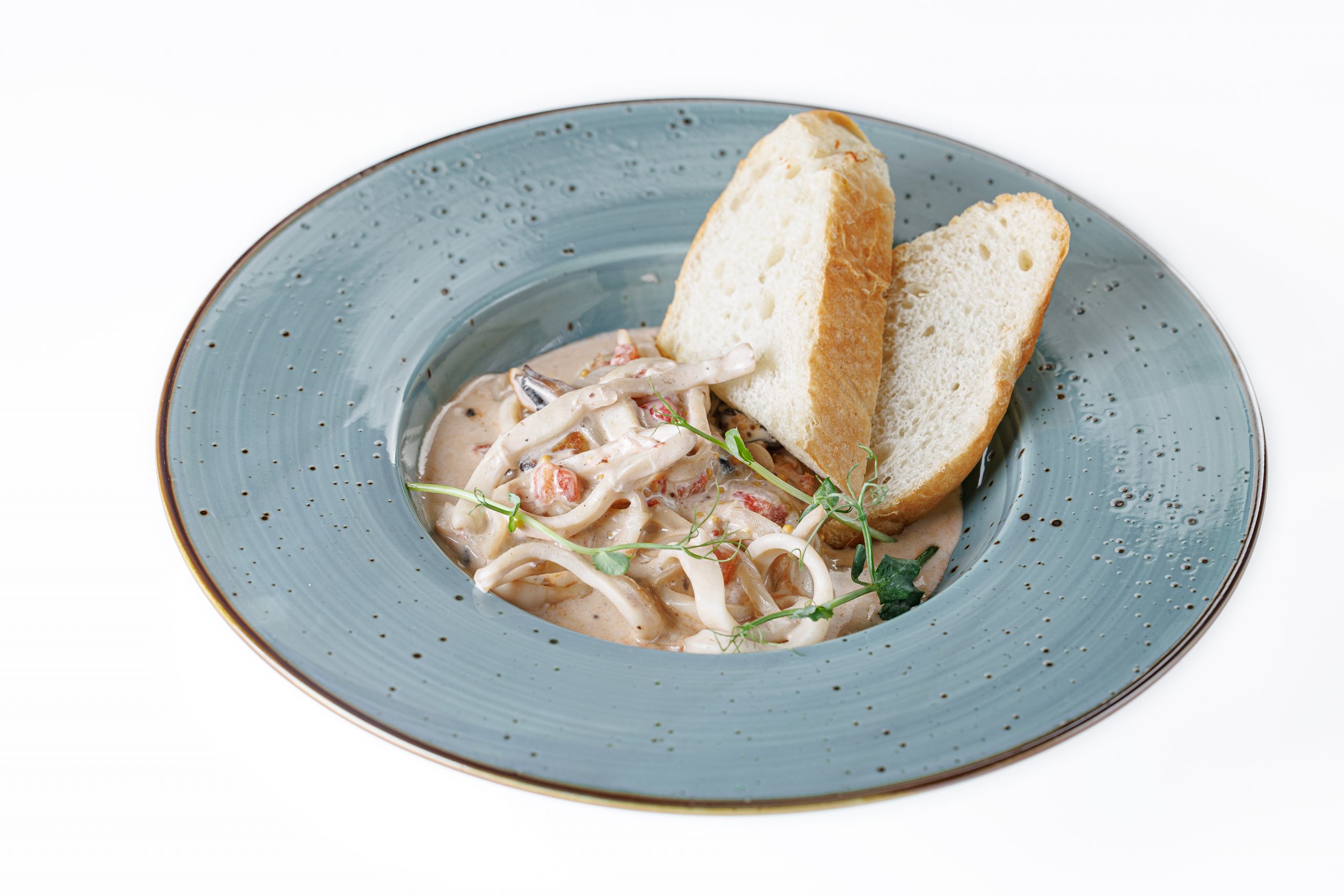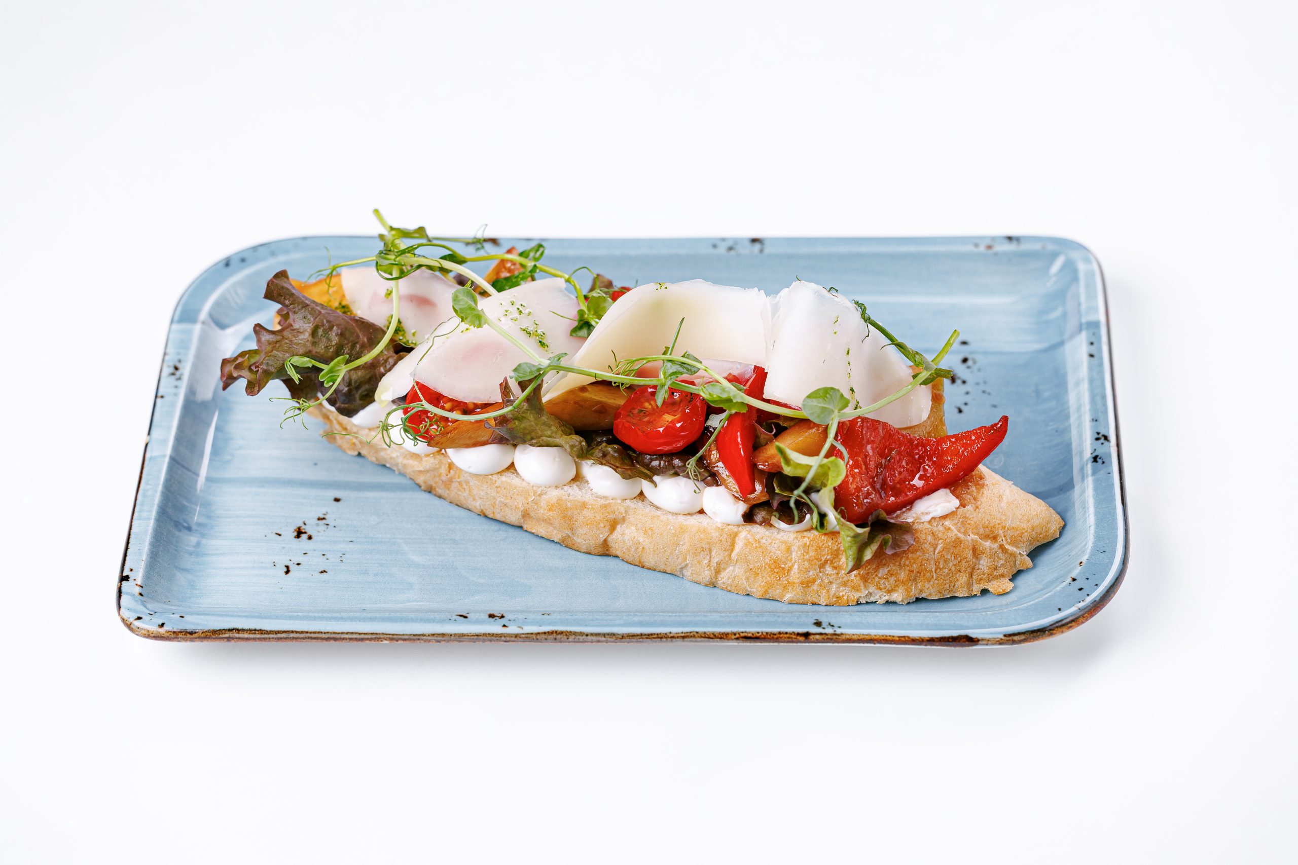(130 гр) чиабатта, пармезан, вяленые томаты, микс-салат, творожный крем, цукини, сладкий перец, микрозелень, чеснок, бальзамический крем