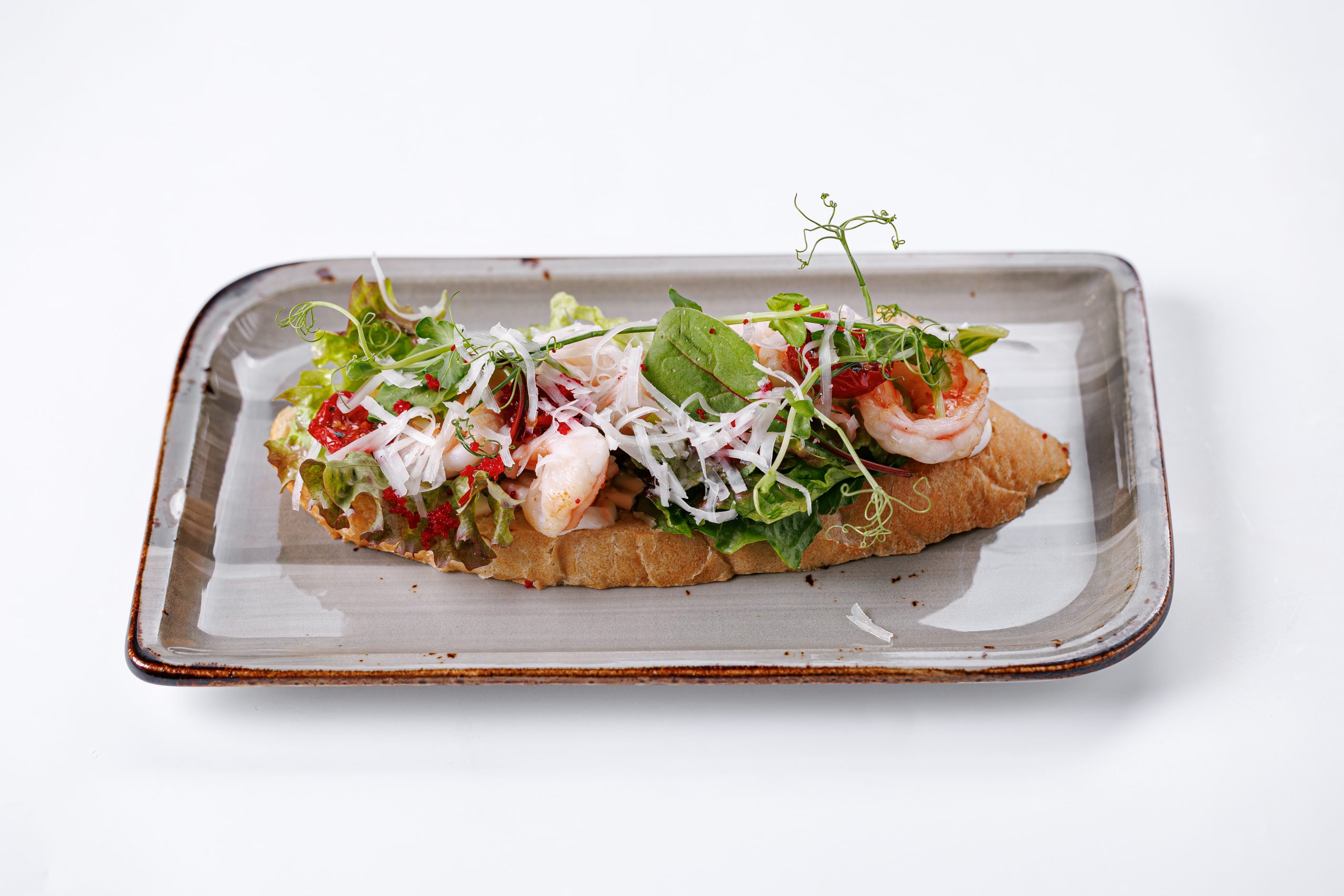 (110 гр) чиабатта, творожный крем, тигровые креветки, икра тобико, зеленое масло, микс-салат, микрозелень
