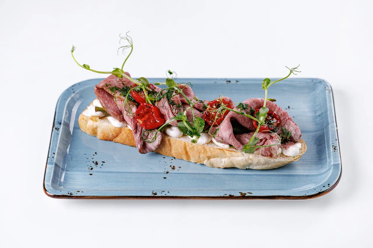 (140 гр) Чиабатта, ростбиф, вяленые томаты, творожный крем, зеленое масло, микрозелен