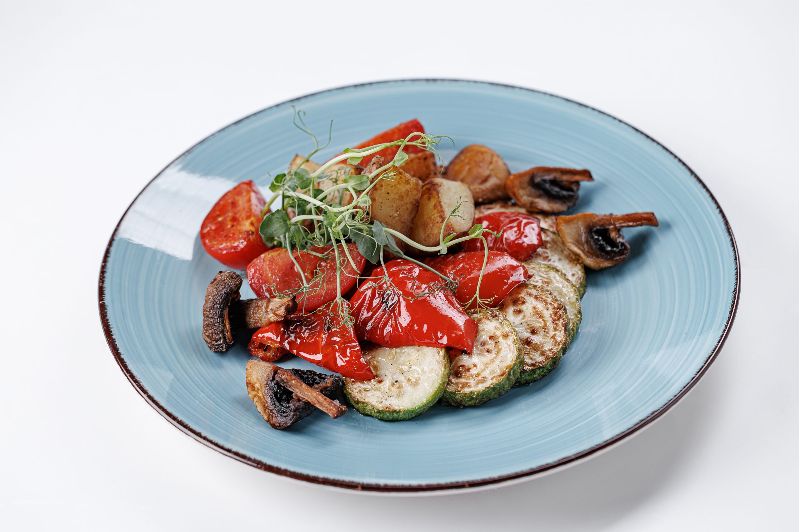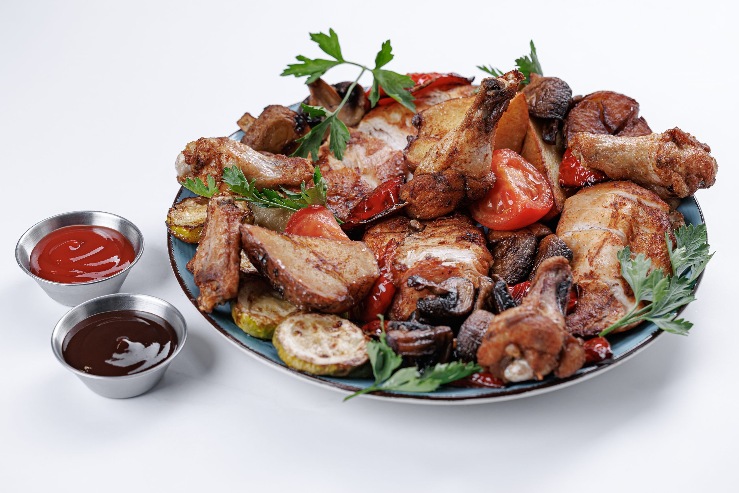 (1440/100 гр) куриное филе, крылья, запечённый цукини, сладкий перец, шампиньоны, томаты, картофель. Подается с двумя соусами и маринованным красным луком