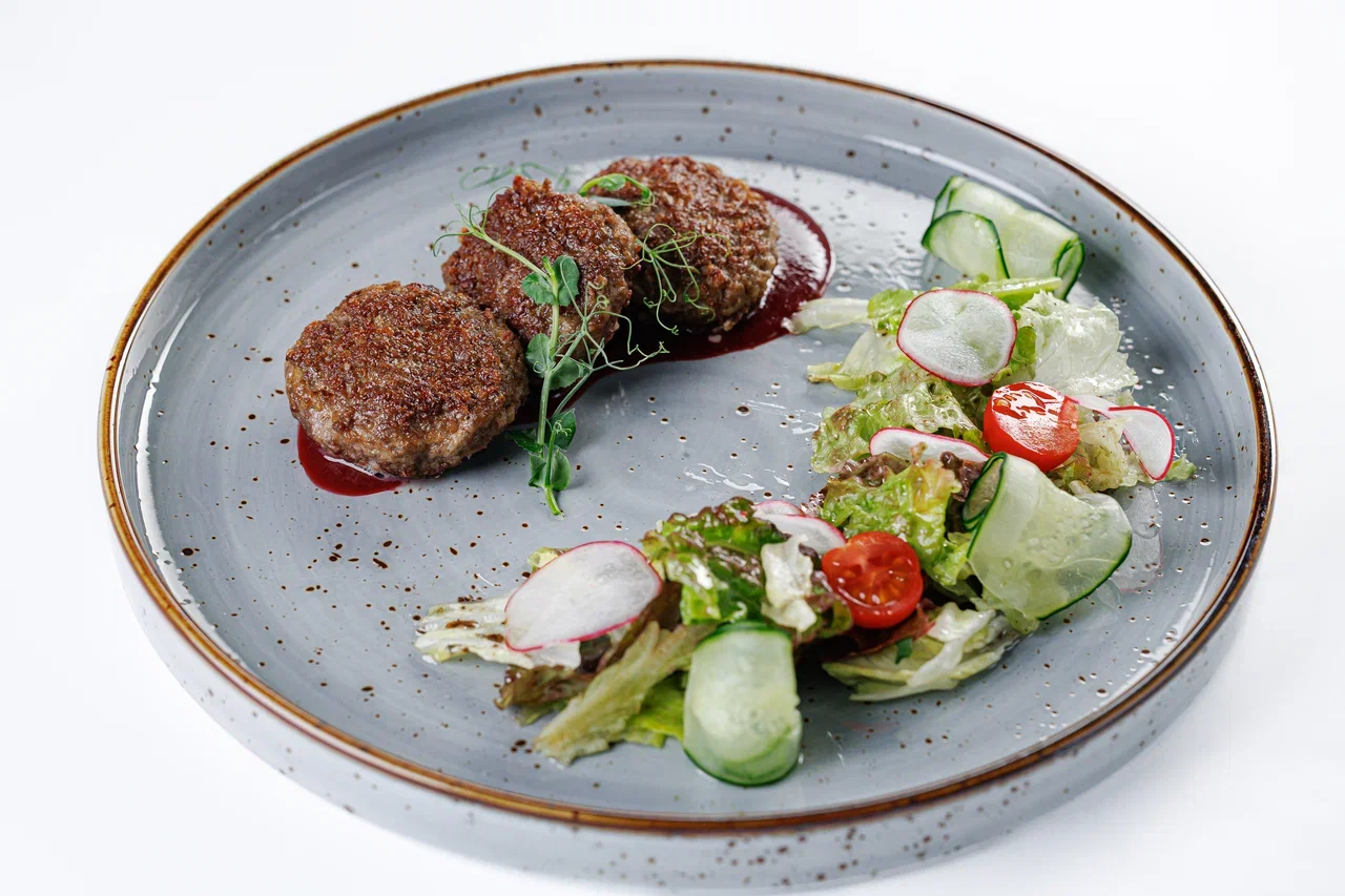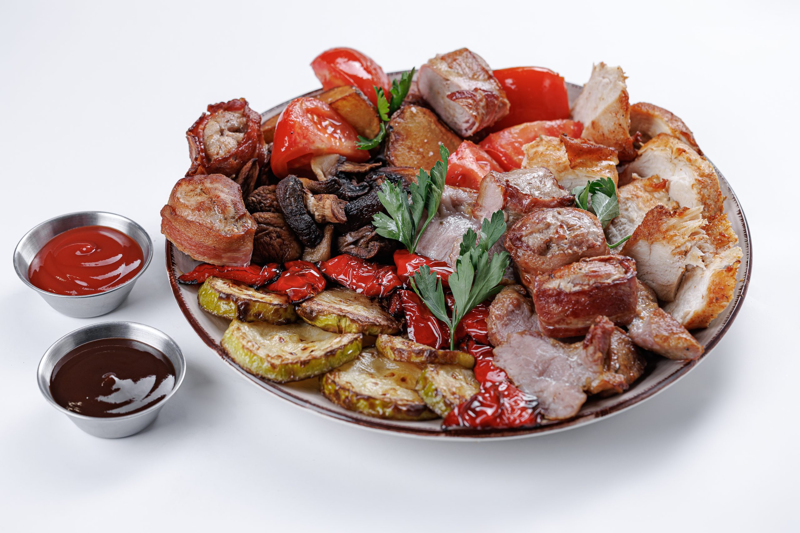 (1170/100 гр) свиная вырезка в беконе, говядина пиканья, свиная шея, куриное филе, запеченный цукини, сладкий перец, шампиньоны, томаты, картофель. Подается с двумя соусами и маринованным красным луком