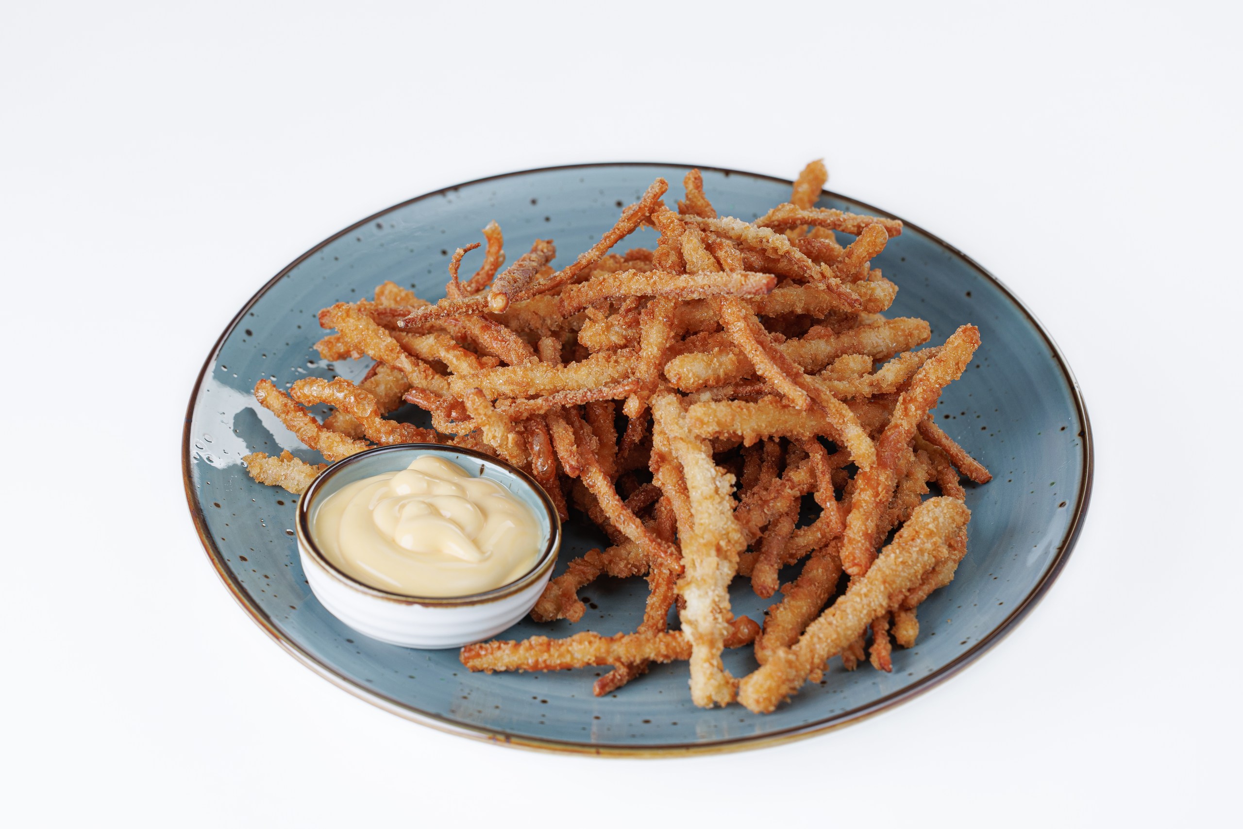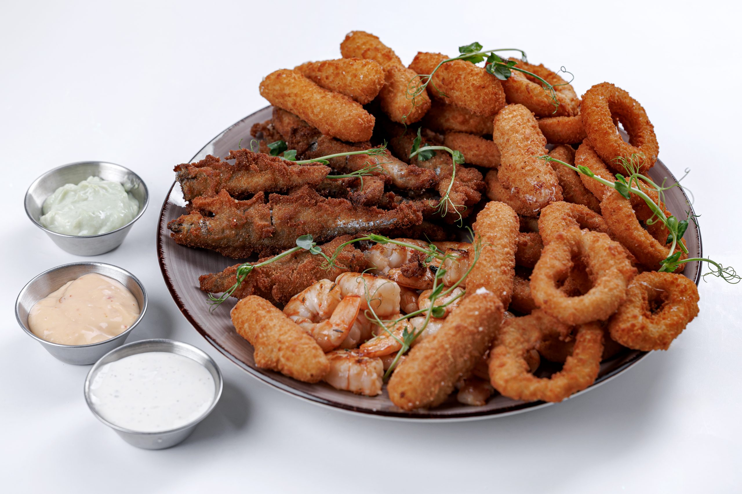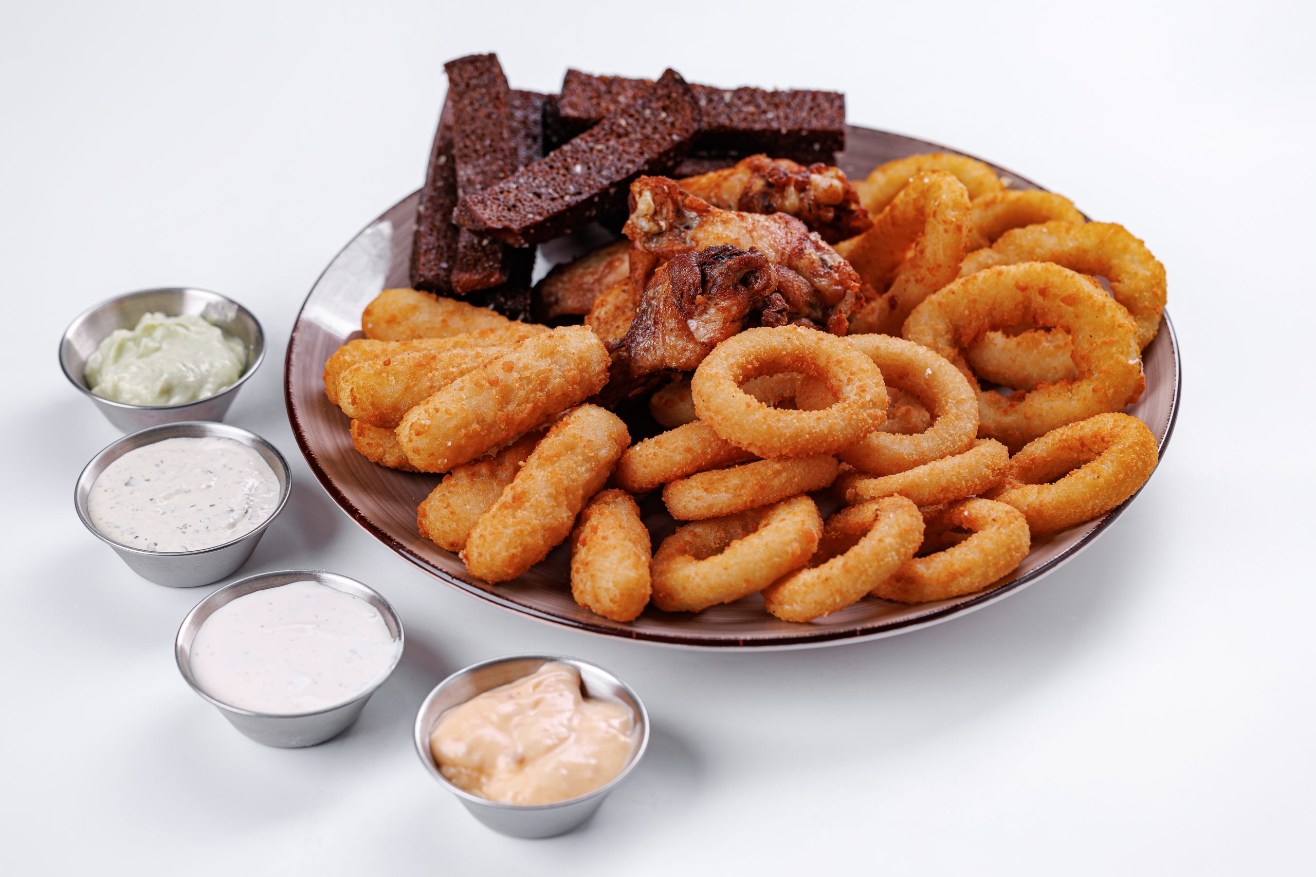 (950/200 гр) куриные крылья, кальмар фри, луковые кольца, сырные палочки, гренки, наггетсы. Подаются с тремя видами соусов