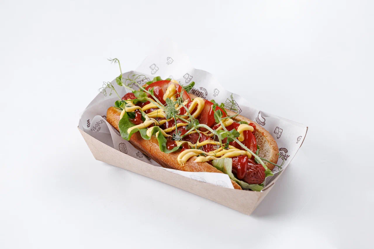 (170 гр) колбаска на выбор, лист салата, огурец, помидор, томатный/сырный соус