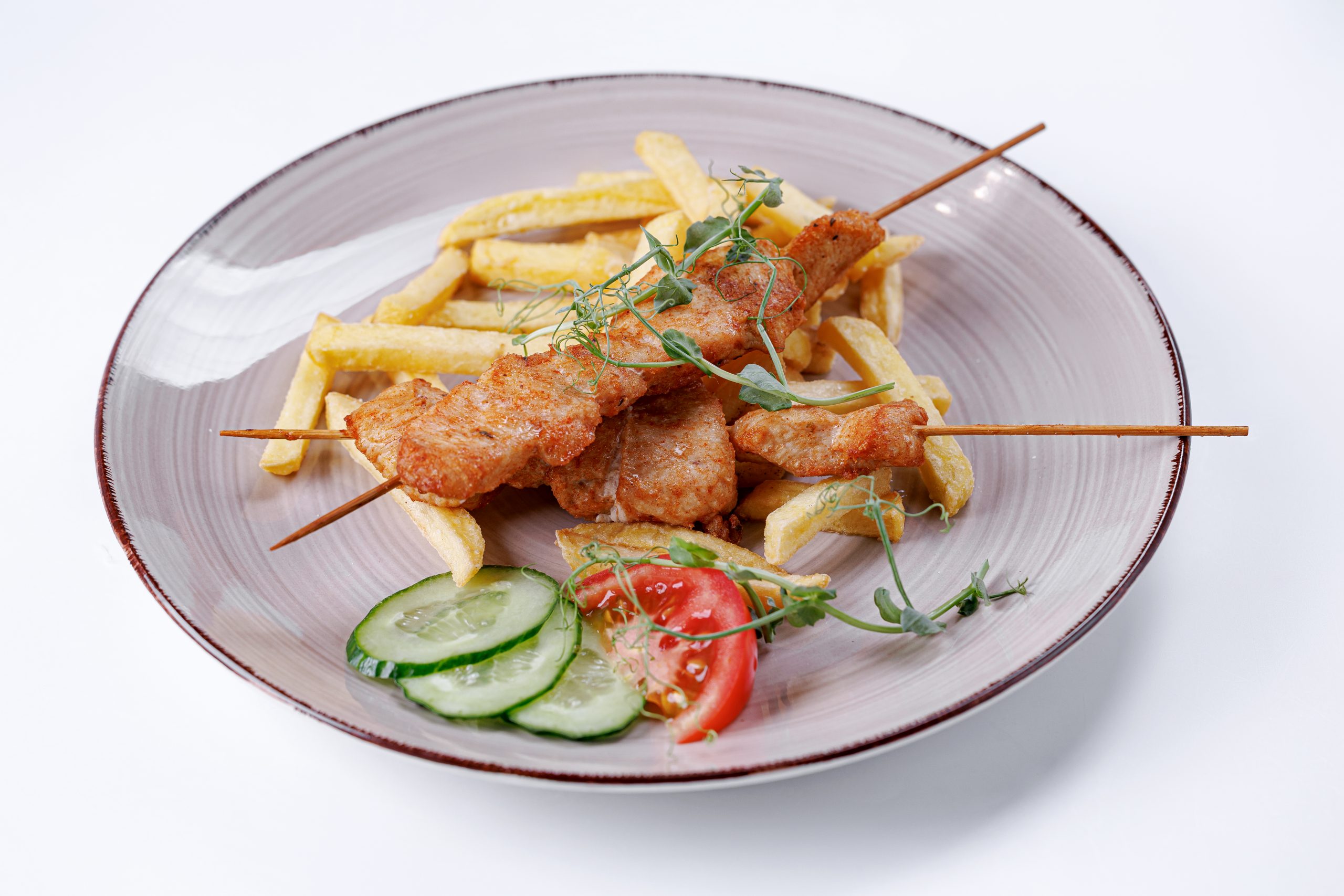 (1440/100 гр) куриное филе, крылья, запечённый цукини, сладкий перец, шампиньоны, томаты, картофель. Подается с двумя соусами и маринованным красным луком