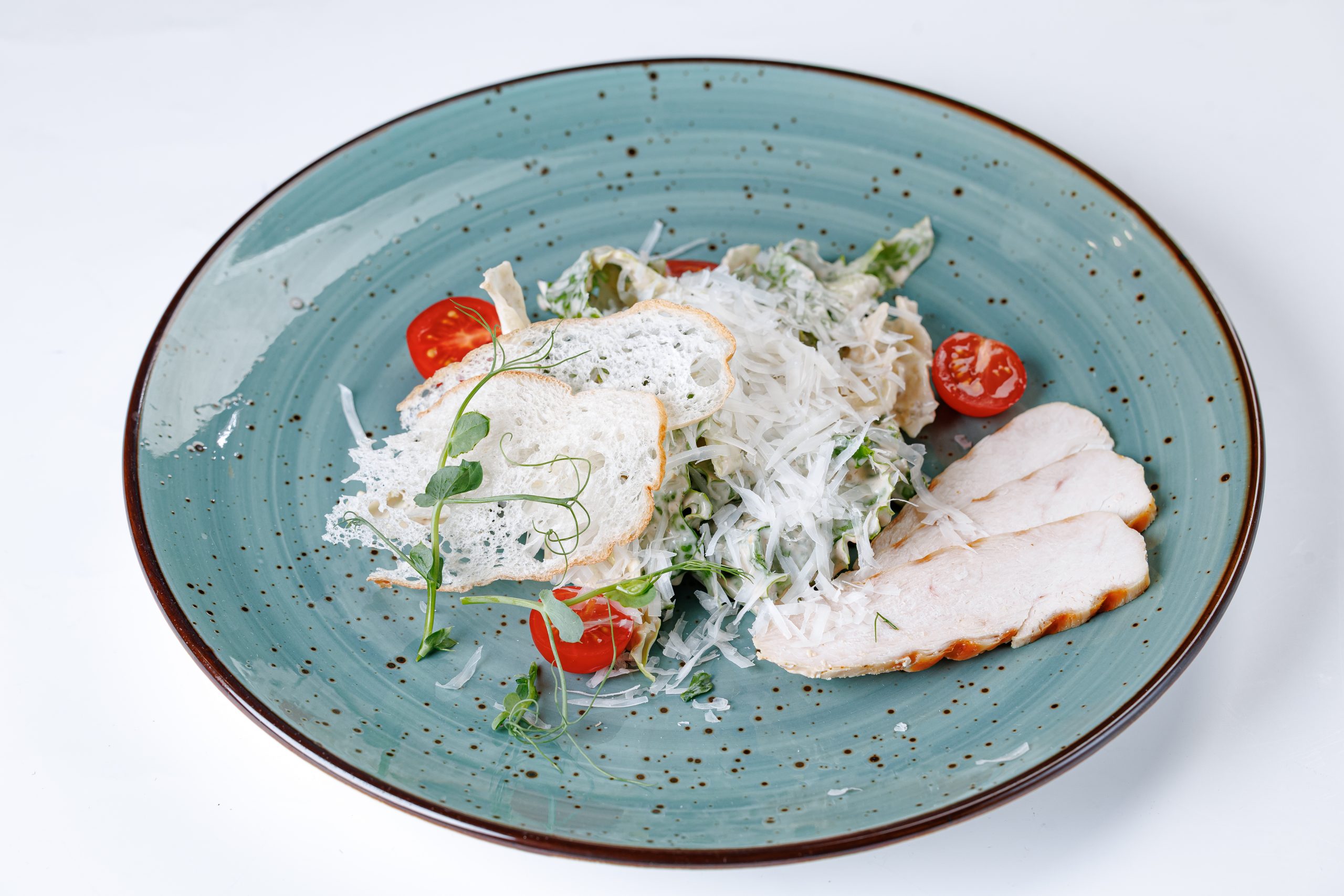 лист салата романо, куриное филею пармезан, яйцо, сухарики,томаты черри с соусом цезарь (150 гр)