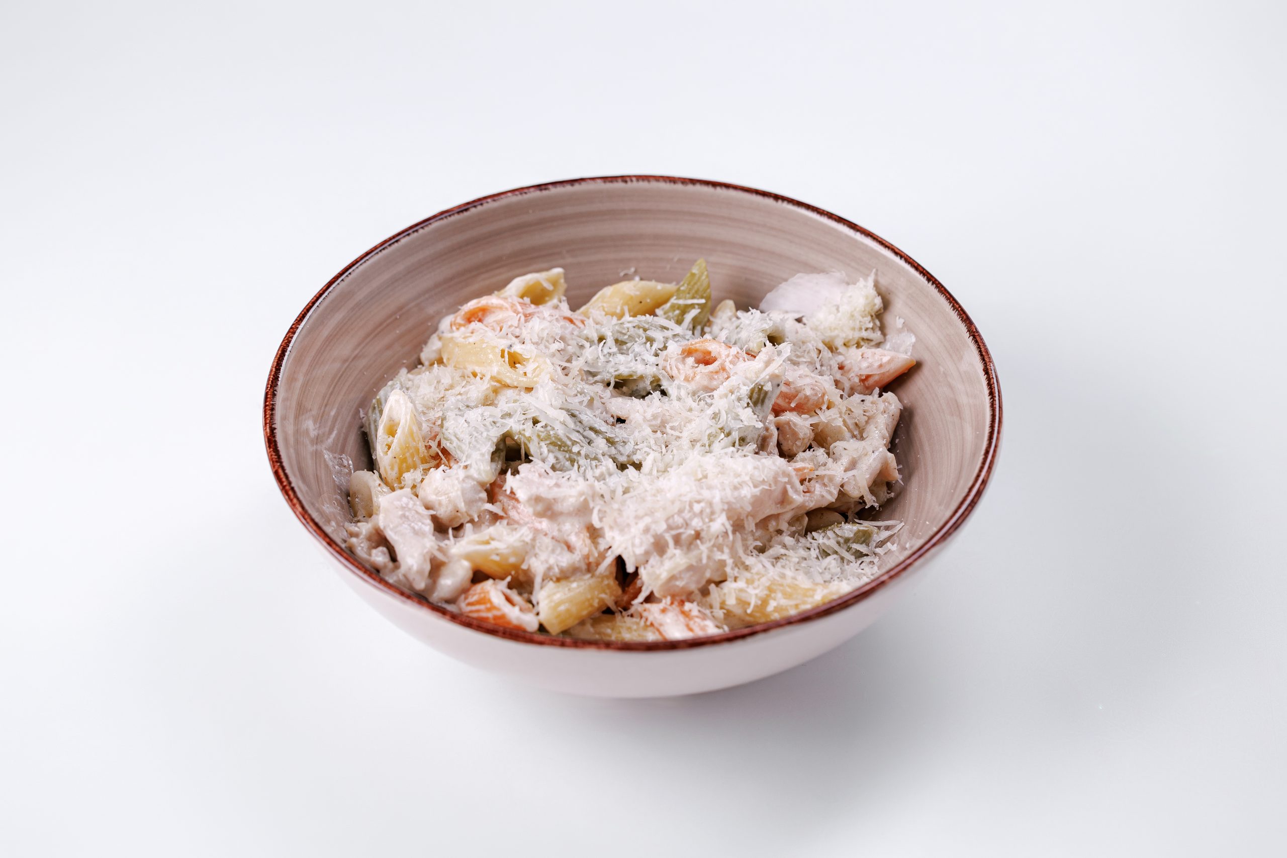 тигровые креветки, пармезан, блю чиз, микс-салат, микрозелень, ореховый соус