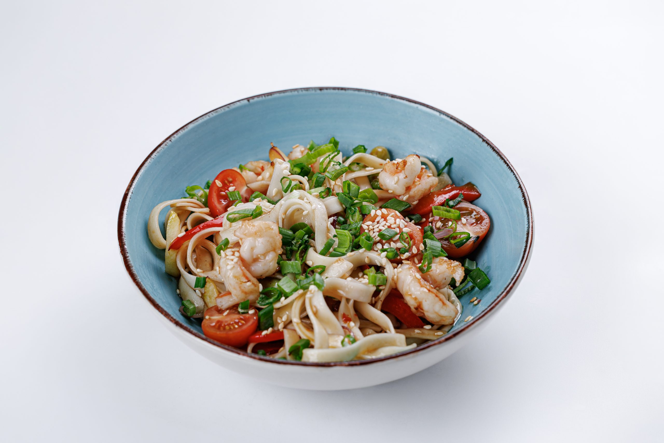 лапша яичная, креветки, перец болгарский, морковь, имбирь, соус соевый