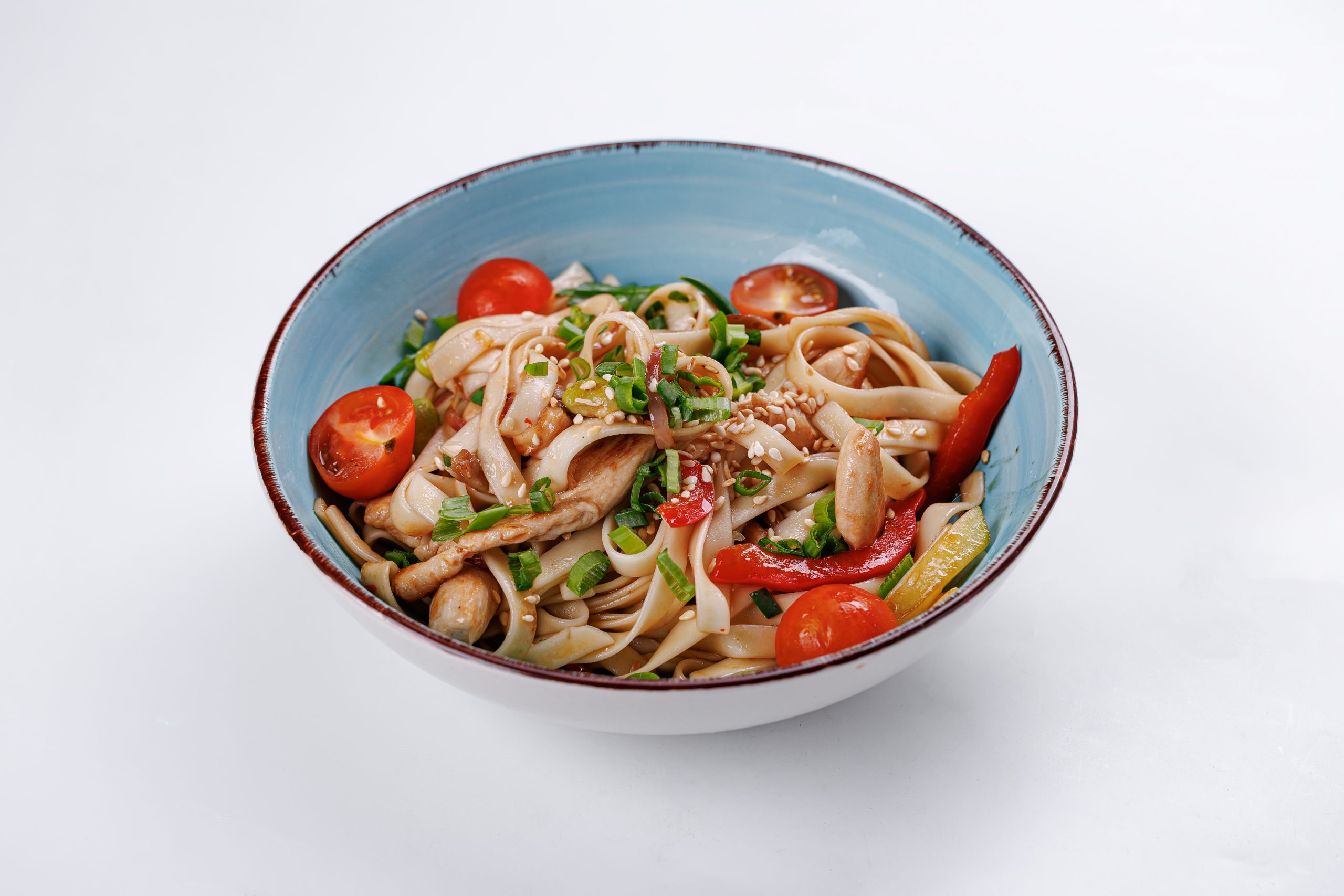 лапша яичная, куриное филе, перец болгарский, имбирь, перец чили, лук порей, соус соевый