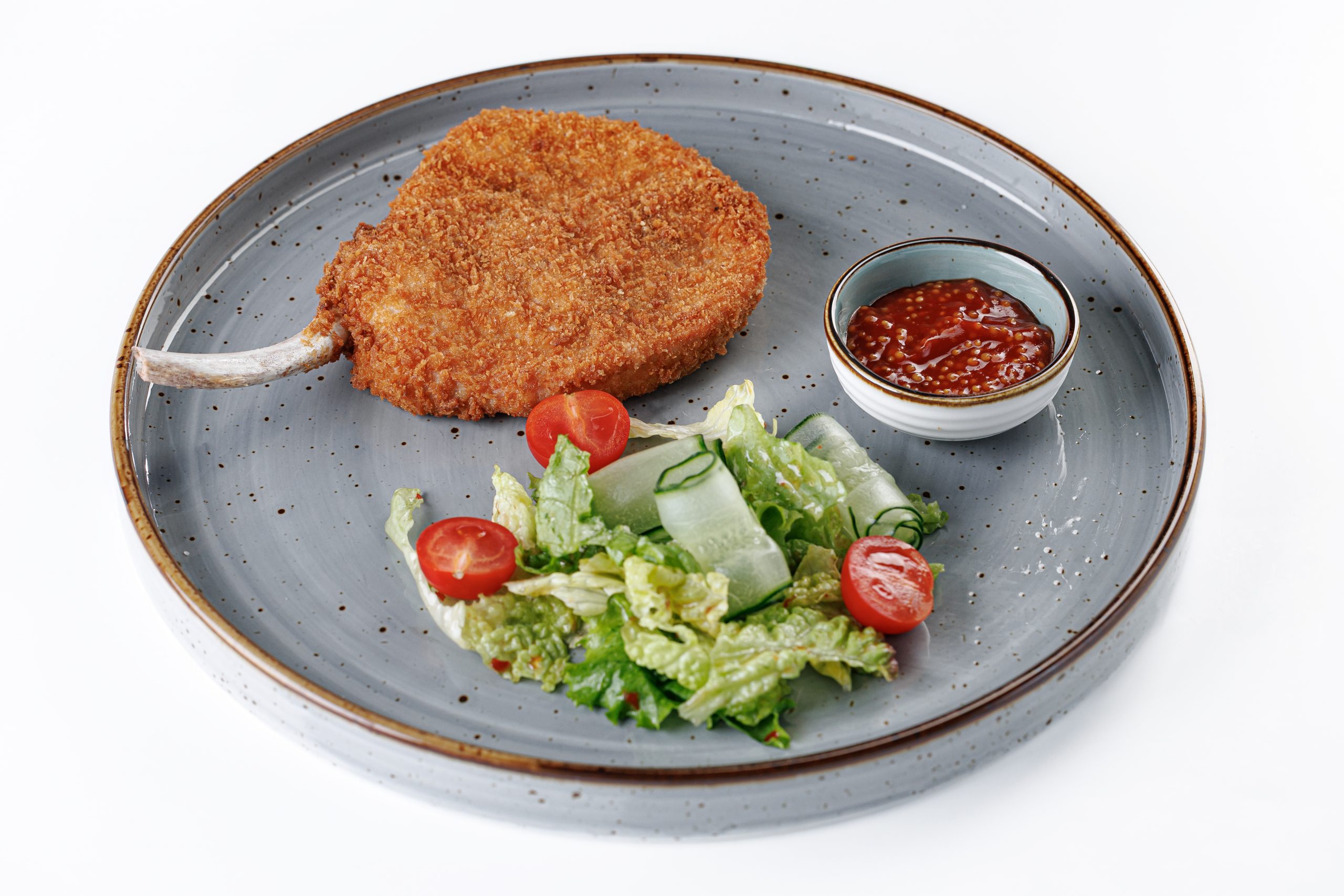 (160/20 гр) куриное филе с салатом из огурцов и листьев салата, с томатным соусом